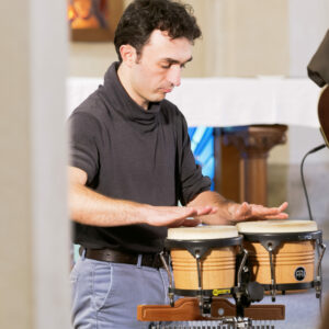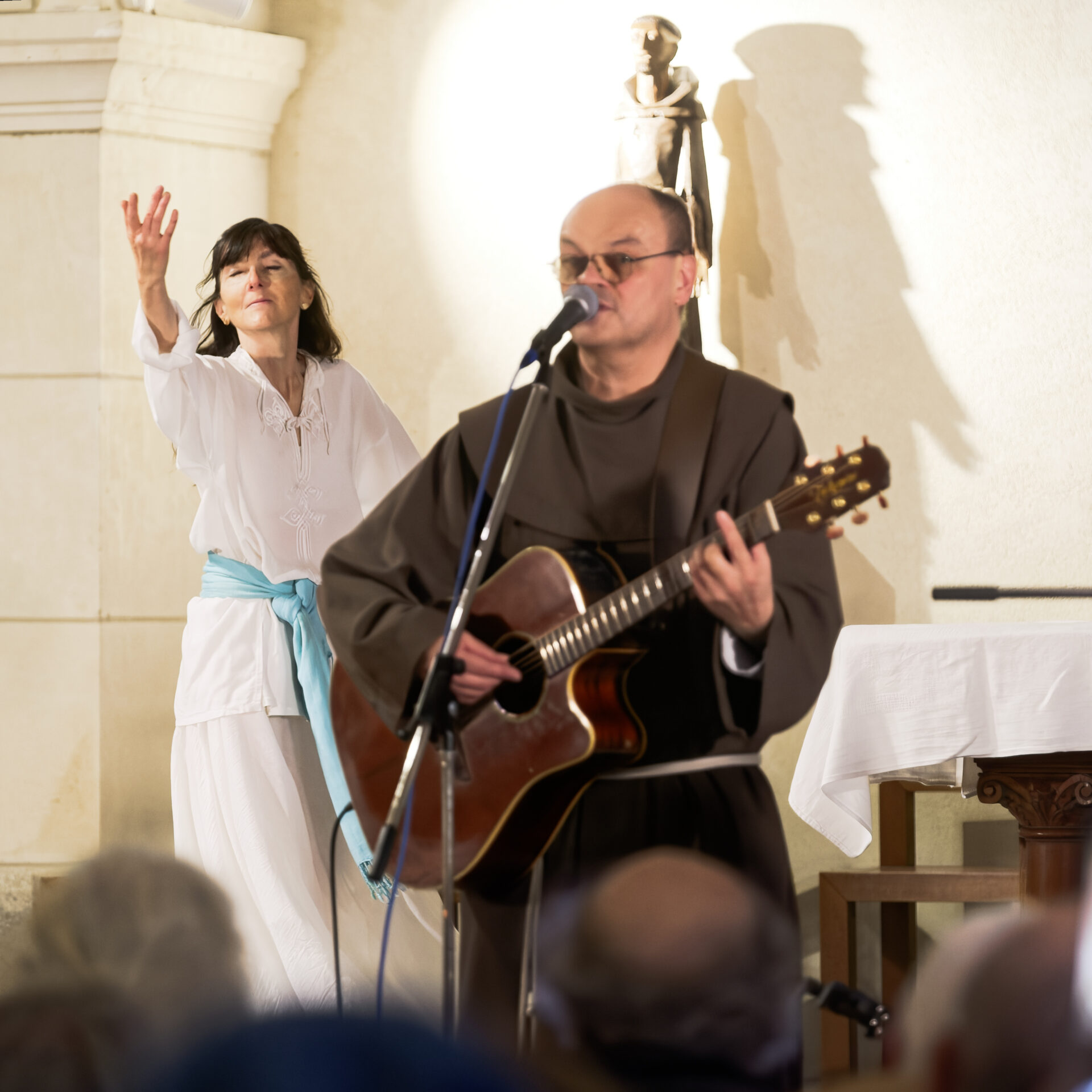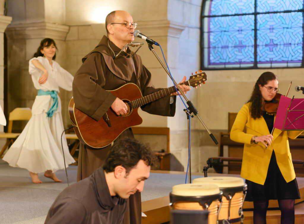 En effet, Frère Jacques était accompagné d’Alexandre et Sophie Merasli au clavier et au violon, de Johann Penneau aux percussions, ainsi que de Sonia Ott, danseuse et chorégraphe en Art Sacré.