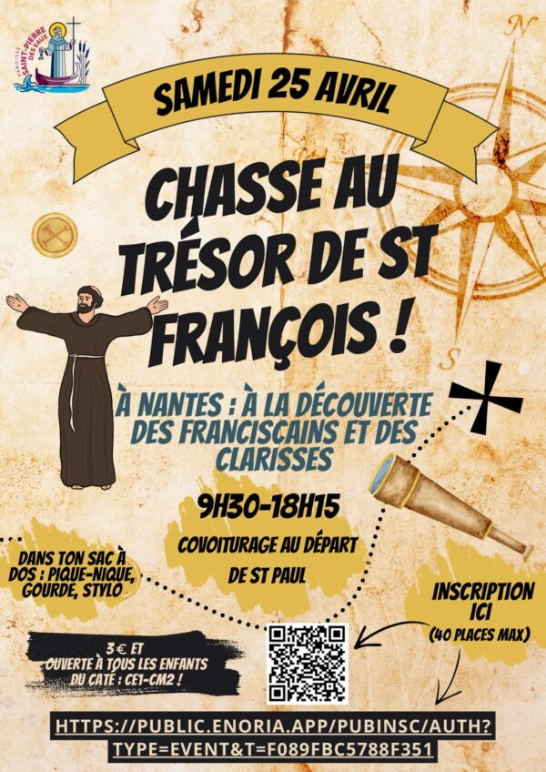 Le samedi 25 avril 2026, une quarantaine d’enfants du catéchisme (CE1 à CM2) de la paroisse de Saint-Pierre-des-Eaux (Doyenné de Saint-Nazaire – Brière) viendront à Nantes pour découvrir Saint François d’Assise en rencontrant les frères Franciscains de Canclaux et les sœurs Clarisses de la rue Molac.